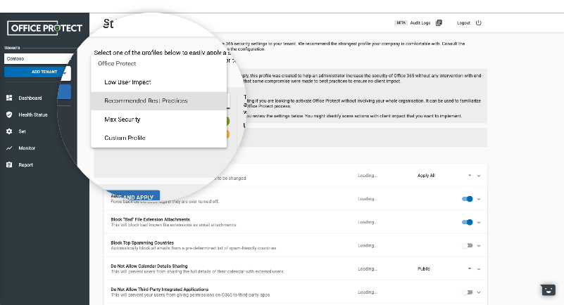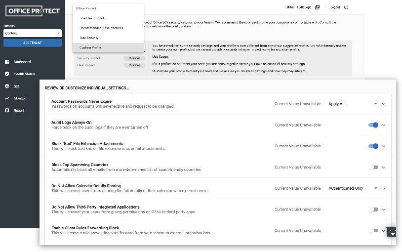 Note that Office Protect lets you create custom security profiles. If you have a specific use case that needs particular settings, then go back to Security Setup section and click to select the “Custom Profile” from the profile selection drop-down menu. Then go through all the settings and adjust each one as needed. Click “Save and Apply” to finalize your changes. You’ll be able to reuse this custom profile for any tenant whose needs match the setting.
