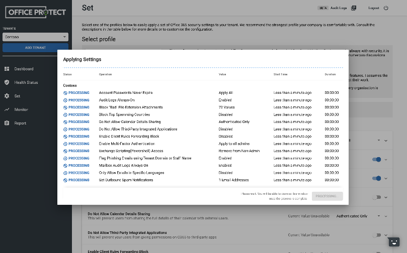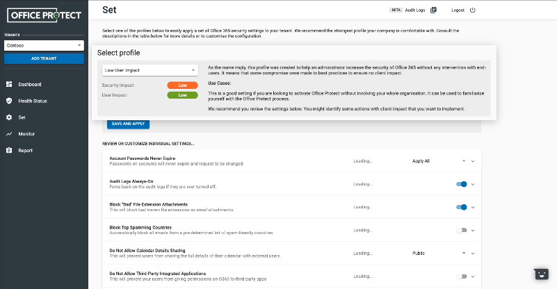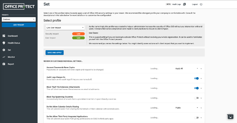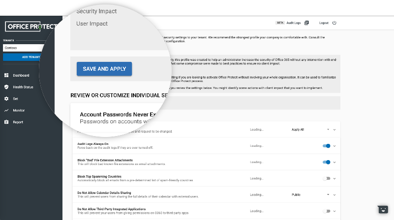 Once you’ve made all your desired changes, click “Save and Apply”. Office Protect will then apply your settings to your Office 365 tenant.