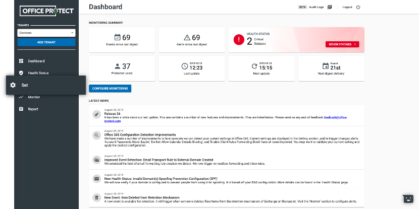 Visit Office Protect's settings page (called the “Set” page) by clicking on the “Set” link in the left-hand side menu.